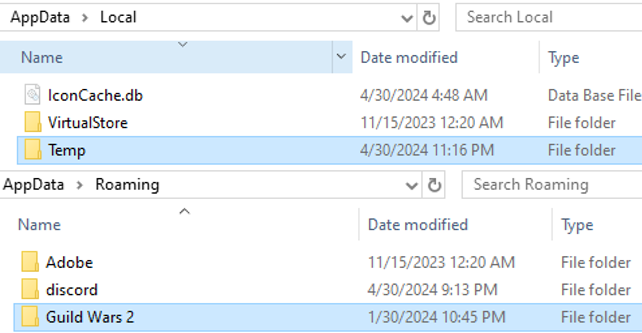 - Finde die Ordner „Temp“ (2) & „Guild Wars 2 - Roaming“ (3):