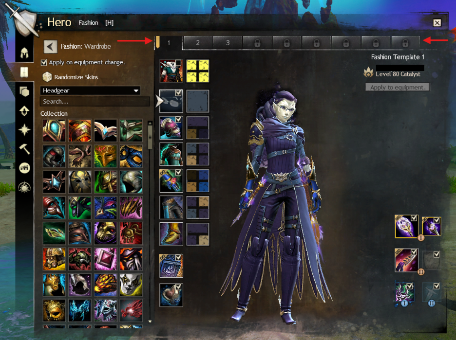 You also have the option to "Apply on equipment change" using the checkbox at the top left of the panel, above the panel containing your unlocked gear skins and/or dyes. If this box is checked, the last applied Fashion Template (indicated with the yellow bookmark icon on its numbered tab at the top of the screen) will AUTOMATICALLY be applied to any new gear you swap into, whether that swap is simply changing a single piece of gear or swapping to another one of your equipment templates.