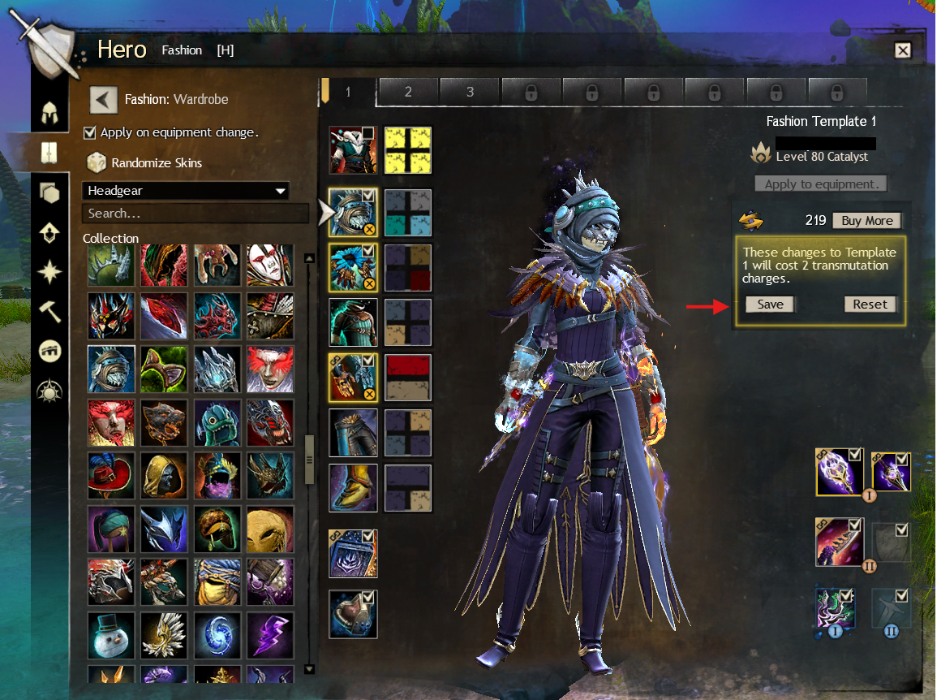 Clicking "Save" after making changes to your Fashion Template is the only time you will be charged Transmutation Charges.