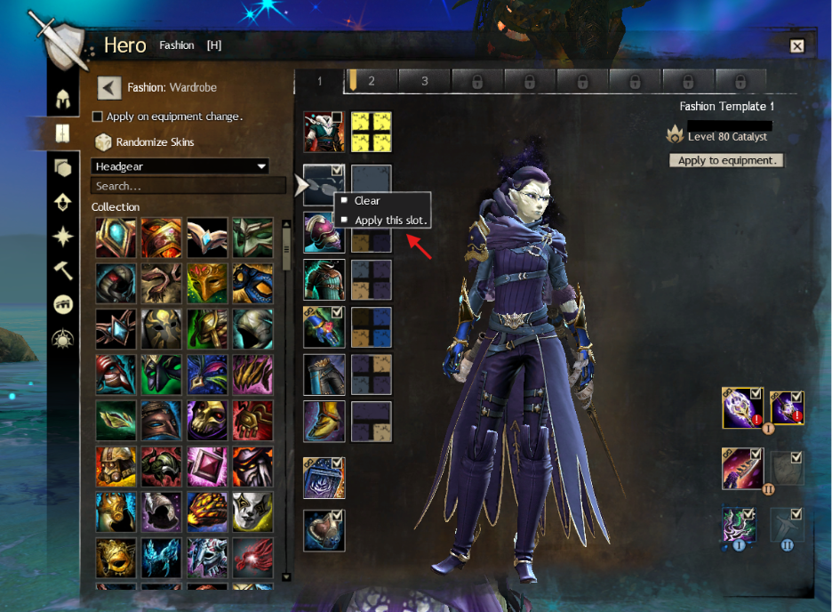 - Apply this slot: Will apply the individual skin saved in this individual slot to the cosmetics currently worn by the character with no Transmutation Charge cost. The option will be greyed out and unable to be used if the character is already wearing the selected cosmetic item. In the example screenshot above, the character is currently wearing a different outfit but clicking “Apply this slot” will allow the character to wear the cosmetic equipped in this slot with Fashion Template 2 equipped, even though the cosmetic in question is saved to Fashion Template 1.