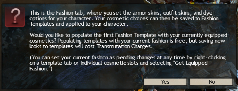 Clicking "Yes" will allow you to save the current cosmetics the character has equipped to one of the template slots without consuming any transmutation charges, and you can use the “Get Equipped Fashion” option (accessed by right clicking any of your Fashion Template slots) to additionally import the current appearances of any other gear sets you may have for free.
