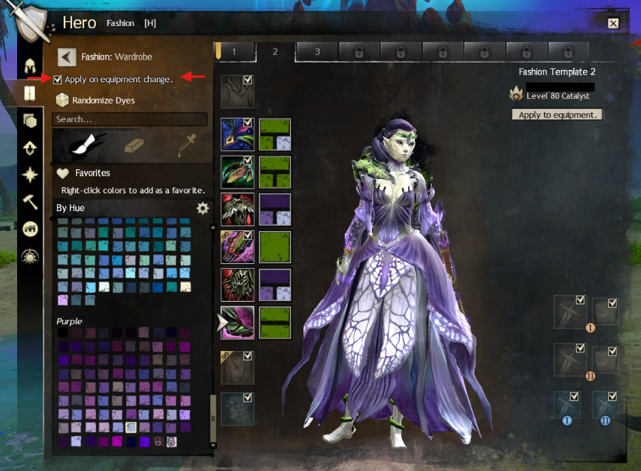 You also have the option to "Apply on equipment change" using the checkbox at the top left of the panel, above the panel containing your unlocked gear skins and/or dyes. If this box is checked, the last applied Fashion Template (indicated with the yellow bookmark icon on its numbered tab at the top of the screen) will AUTOMATICALLY be applied to any new gear you swap into, whether that swap is simply changing a single piece of gear or swapping to another one of your equipment templates.