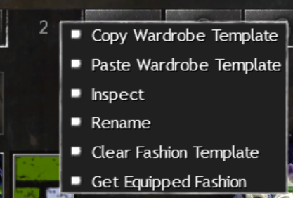 • Paste Wardrobe Template: If you have copied a exported Fashion Template (above,) clicking the Paste option will import it to the currently selected tab. Note that this will not automatically save the imported Fashion Template - you will still need to spend Transmutation Charges to save and use the imported template.