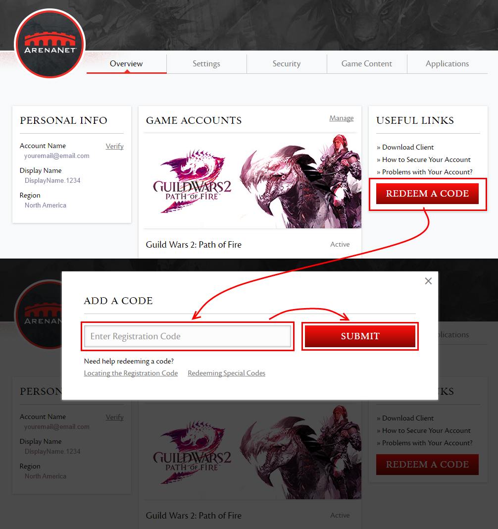 Pour mettre à jour votre compte gratuit afin d'obtenir un compte de base, Heart of Thorns ou Path of Fire, vous aurez besoin d'un code d'activation que vous pouvez acheter sur buy.guildwars2.com ou chez l'un de nos partenaires commerciaux officiels. Après acquisition de votre code, vous pourrez l'échanger en jeu ou sur votre page de gestion de compte :